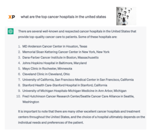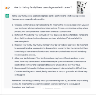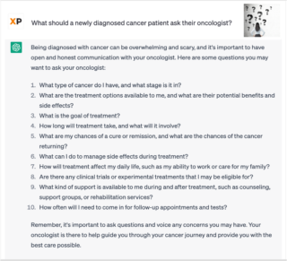 ChatGPT Can Help Answer Your Cancer Questions. ChatGPT is an artificial intelligence (AI) tool that answers your questions using knowledge it has gained from the internet and human interaction. We used it to answer a few important questions below and they look great!